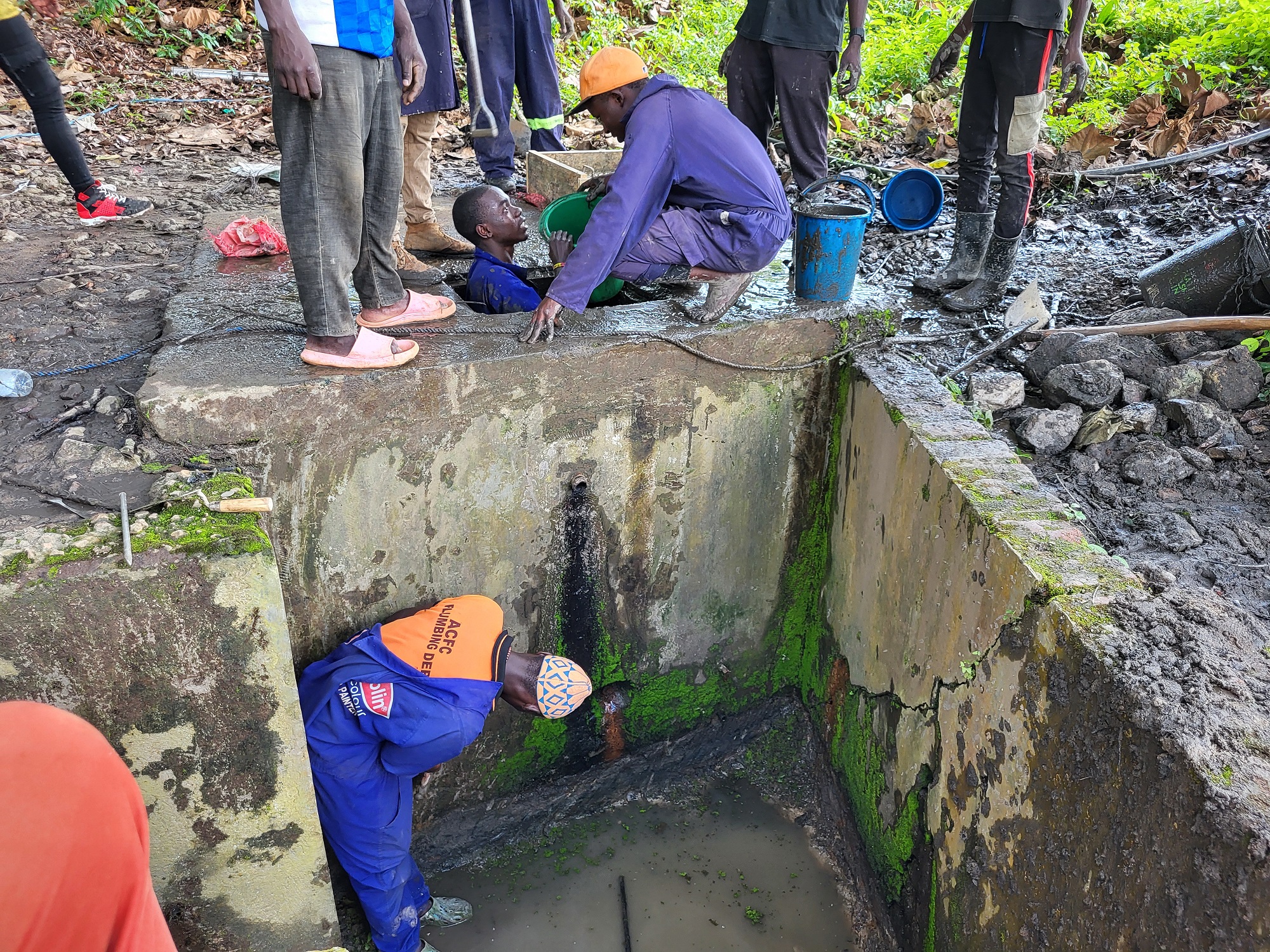 Wir wurden auch zum Schulstandort Bongole gerufen um eine in die Jahre gekommene und ziemlich desolate Quellfassung zu sanieren. Dabei mussten wir die Quellkammer von Sand befreien, eine Zuleitung neu verlegen, die Wasserhähne erneuern, und den Auslauf ausputzen und instandsetzen. Das notwendige Material wurde in landesüblicher Art herangeschafft. Nach Fertigstellung unserer Arbeiten stellten wir dem Schulleiter einen Wartungskatalog auf in der Hoffnung, dass dieser im Sinne der Dauerhaftigkeit der Quellfassung eingehalten wird.