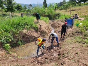 Unsere erste praktische Aufgabe war die Neuerrichtung einer Quellfassung auf dem Schulstandort in Kalangaalo. Bis dahin wurden die Schule und das nahegelegene Dorf nur mit in Tanks gesammeltem Regenwasser und mit ungereinigtem Flusswasser versorgt, das aus einem nahegelegenen Bach entnommen und hochgepumpt wurde.