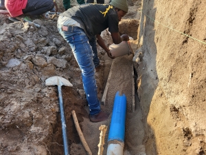 Wir legten zuerst die Quelle frei, bauten Filtersand und Filterkies zur natürlichen Reinigung des Wassers ein, sammelten es in einem darin verlegten Filterrohr, führten das Wasser zu einem nahegelegenen Pumpenschacht und pumpten von dort das Wasser zum höchstgelegenen Punkt der Schule, um es von dort im freien Gefälle zu den Schulküchen und zu einer Wasserentnahmestelle im nahegelegenen Dorf zu verteilen.