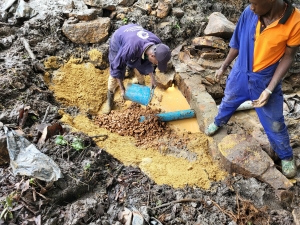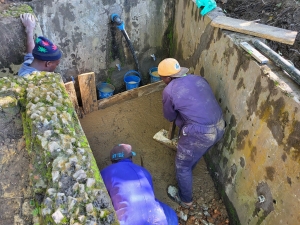 Wir wurden auch zum Schulstandort Bongole gerufen um eine in die Jahre gekommene und ziemlich desolate Quellfassung zu sanieren. Dabei mussten wir die Quellkammer von Sand befreien, eine Zuleitung neu verlegen, die Wasserhähne erneuern, und den Auslauf ausputzen und instandsetzen. Das notwendige Material wurde in landesüblicher Art herangeschafft. Nach Fertigstellung unserer Arbeiten stellten wir dem Schulleiter einen Wartungskatalog auf in der Hoffnung, dass dieser im Sinne der Dauerhaftigkeit der Quellfassung eingehalten wird.